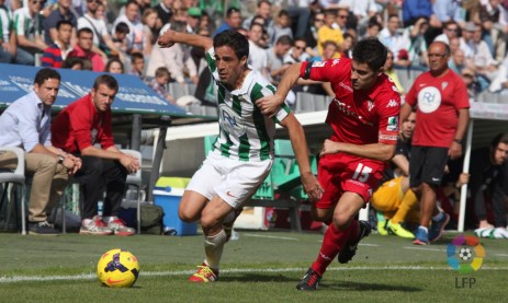 Desde el arranque se comprobó que éste iba a ser un partido intenso entre dos aspirantes al ascenso, no había más que echar un vistazo a las gradas y escuchar los cánticos de la afición cordobesa. Con más de 14.000 espectadores en El Arcángel, cien de ellos rojiblancos, una soleada matinal dominical y una agradable temperatura, el buen fútbol parecía asegurado. Y lo hubo, vaya que si lo hubo. El intercambio de disparos y ocasiones resultaba atractivo y emocionante, con Isma López muy activo en los ataques del Sporting y suyas fueron las dos primeras ocasiones. La igualdad se mantuvo hasta que la balanza se desequilibró a los veinte minutos. Valdés Aller se tragó el piscinazo de Samuel y desniveló el partido. Carlos Caballero, haciendo honor a su apellido, no desperdició la concesión arbitral y transformó el penalti. Este gol dejó muy tocados a los sportinguistas, los blanquiverdes se divertían y Pedro casi sentencia tras una jugada que culminó con un disparo que se marchó alto.
